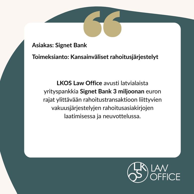 Toimeksiannosta vastasivat: Oscari Seppälä ja Liene Krumina.LKOS Law Office avusti Signet Bank AS:ää 5 miljoonan euron uudelleenrahoituksessa Suomessa