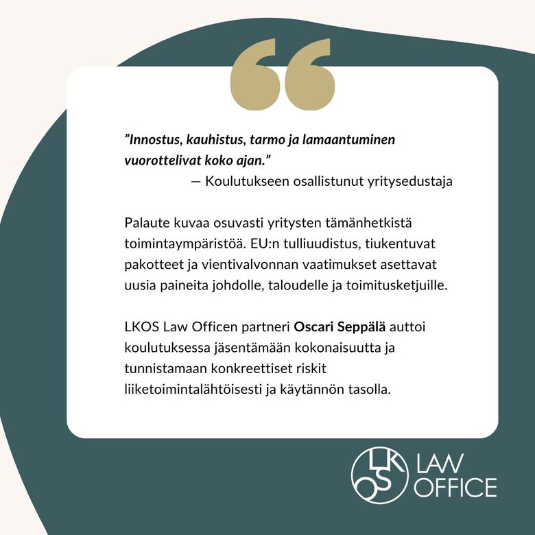 Näin kuvasi eräs osallistuja kokemustaan koulutuksesta Muuttuvat tullit ja riskienhallinta: Tullien, pakotteiden ja vientivalvonnan kokonaiskuva – turvaa rahavirrat, jonka asiantuntijakouluttajana toimi LKOS Law Officen partneri Oscari Seppälä.